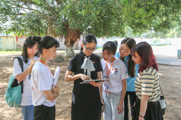 莫琼玉一行先是来到了教科院“暖风筑梦”社会实践队所在的雷州市客路镇迈哉小学,观察和了解了实践队的饮食情况和宿舍环境,并与实践队队员进行交流。莫琼玉仔细询问了队员们有关厨房运作等后勤问题,叮嘱他们要时刻注意用电、用水安全,同时她要求实践队支教组在课程设置和活动安排上做到专业、有条理,鼓励队员们学以致用,将自己学到的教学方法运用到实际教学中。在数计院“筑梦”社会实践队所在的雷州市客路镇本立小学,莫琼玉在与实践基地领导和实践队队员交谈的过程中,建议实践队员结合专业知识,进一步完善乡土博物馆和本地植物园,并运用到实际实践教学。