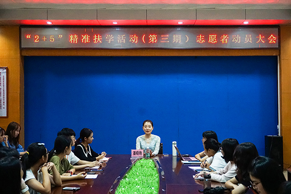 为弘扬志愿助学,10月17日晚,岭南师范学院“2+5”精准扶学活动(第三期)志愿者动员大会在鸿园418室如期举行。校团委老师潘晓艳、校志联会项目部干部以及本期“2+5”精准扶学活动的志愿者们参加此次动员大会。