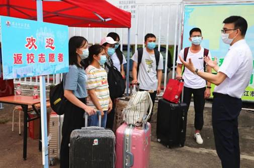 校团委书记李发武和全体领导老师,化学化工学院团委负责人刘晓颖、机电工程学院团委负责人杨丽君前往各个站点迎接返校志愿者的到来。看到一批批顺利接回来的新生,李发武热情欢迎他们返校并叮嘱他们注意安全。为了第一时间将志愿者安全地接回学校,校团委提前在麻章车站和湛江车站安排了两辆大巴,在车站设点处轮流值班,全天候等待归来的志愿者们,并且贴心地给志愿者们准备饮用水、酒精搓手液、为他们测量体温、拉送行李,确保志愿者们的安全。