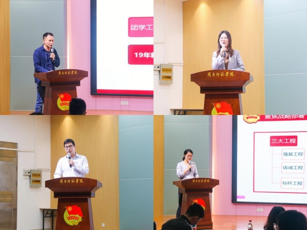 各二级学院团委负责人和学生会指导老师从学院工作总体情况、主要亮点、重要成绩、存在问题等方面进行了述职汇报。李发武在倾听各二级学院团委述职后指出学院普遍存在顶层设计不明显,没有明确的、独特的工作思路;共青团改革力度、速度、温度不够;主责主业抓得不够精准,重点工作和难点工作措施不得力等问题,并对照各二级学院团工作进行点评,准确提出存在问题,科学提出发展建议。他为做好今年团工作提出四点建议:第一强化理论武装,凸显团的政治性;第二加强顶层设计,找准发展方向标;第三坚持步调一致,团结一心齐步走;第四做到重心下移,擦亮团学新品牌。李发武强调在推进团的基层建设工作中,重点在基层,发展靠基层,要让基层焕发闪耀光彩。莫琼玉指出学生会工作存在凝聚力、战斗力、执行力、品牌影响力不强等突出问题,提出应从加强顶层设计,提高工作成效,注意发展方向,打造学院特色,拓展服务途径,重视品牌宣传七个方面解决问题。