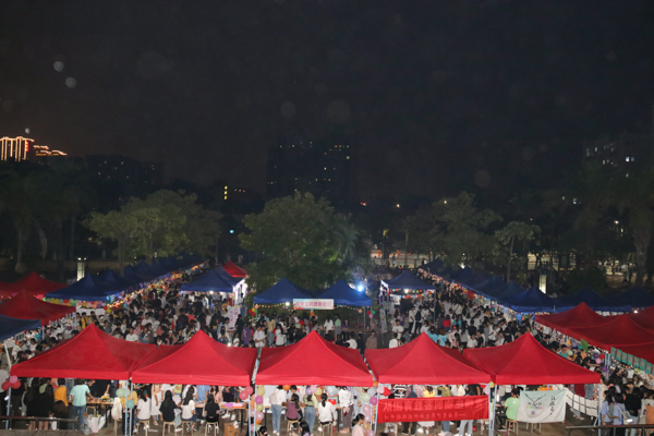 夜幕降临时,体育馆旁广场一片灯火通明,人头涌动。现场表演节目的舞台前围满了观众,社团摊位排着长长的队伍,同学们耐心地等候报名。