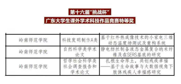 获得特等奖的作品是朱旭鹏、廖峻老师指导的《基于红外热成像技术的小家电三维动态温度场测试及重构系统》、陈小军老师指导的《静电纺丝制备液态金属复合纳米纤维及在SERS基底的研究》和郑剑虹、李继波老师指导的《扎根生命厚土,共创残疾幸福 ——基于生命故事与大数据视角下肢体残疾人幸福感研究》,分别属于“科技发明制作类”、“自然科学类”与“哲学社会科学类”。
