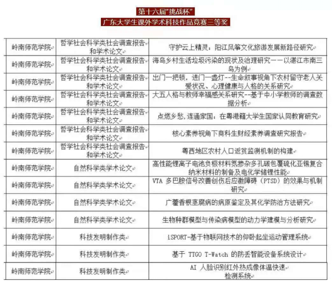 此外,在当天颁奖仪式上,广东省高等教育学会发布了首个《广东省高等院校大学生群众性创新创业活动活跃度研究报告(2021)》,从大学生群众性创新创业活动的角度,对广东省高等院校师生参与共青团组织的各类创新创业项目和赛事的情况进行比较和分析,通过“大学生群众性创新创业活动活跃指数”,来反映广东省高等院校大学生群众性创新创业活动的活跃度。岭南师范学院位于广东省普通高等学校本科院校第17位。