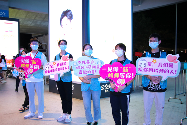 列车进站前,校团委老师和志愿者们早已在接待点等待多时,终于在23:59分接到了第一批新生。一位位披着蓝马甲的志愿者分列在出站口的两旁,笑脸盈盈地为新生送上入校祝福并引导他们出示粤康码和行程卡;一个个被高举着的暖心标语牌,以“宝,我们是接你回岭师的人”、“确认过眼神,你是岭师人”的趣味标语为舟车劳顿的他们带来欢笑;一把把椅子有序放置在岭师接待处内,等待着新生与新生家长入座休息。