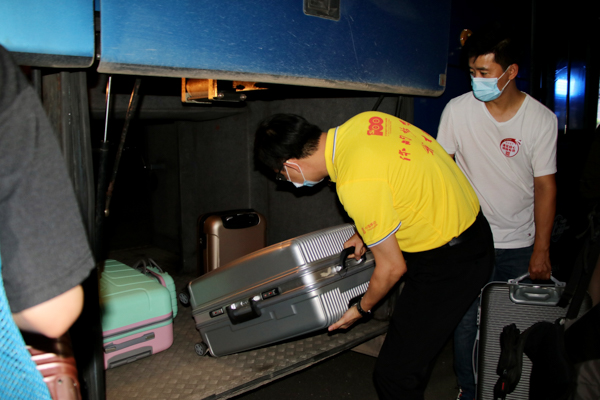 当第一缕阳光照射在湛江西站的地面时,凌晨迎新的志愿者登上了返校的大巴,新一批的志愿者再次接过迎新工作的接力棒。