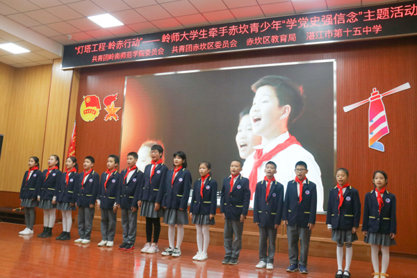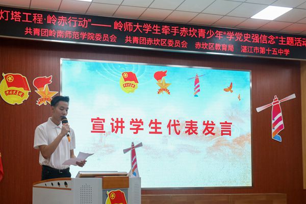 11月8日上午,共青团岭南师范学院委员会、共青团赤坎区委员会、赤坎区教育局携手走进湛江市第十五中学,开展党史宣讲,正式启动“灯塔工程·岭赤行动”——岭师大学生牵手赤坎青少年“学党史强信念”主题活动。