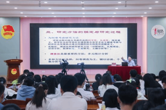 如何确定“挑战杯”竞赛选题,郑剑虹认为,一是要浏览全国性竞赛获奖的论文并进行分析;二是要关注近年的国家重要文献与报告;三是要关注哲学、经济、社会、法律、教育、管理等6个学科的热点问题。郑剑虹强调研究方法的重要性,并建议同学们善用实验法、调查法、质性研究法等多种研究方法。此外,他还详细地解释如何撰写论文的目的、摘要、思路、方法和作品的实际意义,鼓励学生充分利用好互联网、论文数据库等资源,提升自身的文字组织能力。