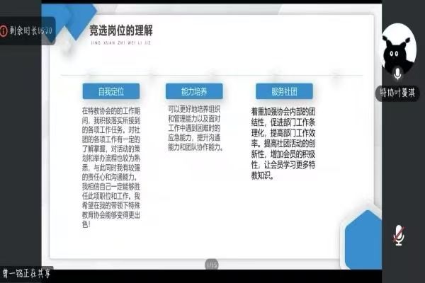 会议伊始,主持人详细介绍会议流程与竞选规则。随后,来自教师技能研究协会、棋类与儿童智能训练研究协会、学前教育协会、心理健康教育协会、手工制作协会以及特殊教育协会六大学生社团的候选人依次登场,发表竞选宣言并进行答辩。他们结合自身特长与实践经验,从制度完善、活动创新、团队建设、学生服务等多个维度,深入阐述了对学生社团未来发展的规划与构想,充分展现出对学生社团工作的热情与担当。