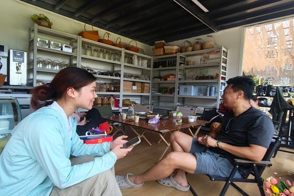 成员深入茶舍采访当地游客(裴文敏 摄)