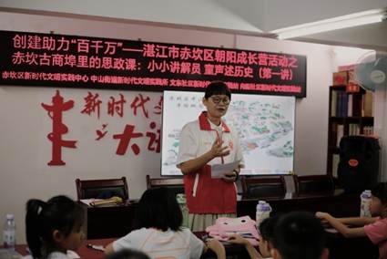 7月8日早上,志愿者老师为文东社区的同学们带来了一场赤坎古商埠的历史讲解课,她用轻柔的声音,吹开了藏匿在青砖粉瓦间的旧时光。从赤坎古商埠的“前世今生”的对比变化中,老师带领着学生触摸赤坎本地历史的温度,更在他们稚嫩的心灵里埋下一颗颗讲述历史的种子,让童声响奏在历史的交响乐里,融汇进时代的长河中。