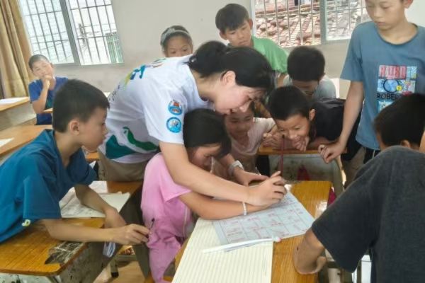 支教老师马舒纯教小朋友写毛笔字(李思敏 摄)