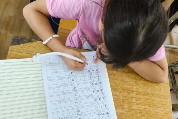 随后进行的书法课堂,则展现了传统文化技艺的传承。支教老师马舒纯、陆榛精心指导学生们进行硬笔与软笔书法的基础练习。她们从正确的握笔姿势和基本运笔方法入手,耐心示范、逐一辅导。在老师的悉心指导下,多数学生能够初步掌握要领,独立完成符合要求的书写练习,在点横撇捺间感受汉字之美与书写之趣。