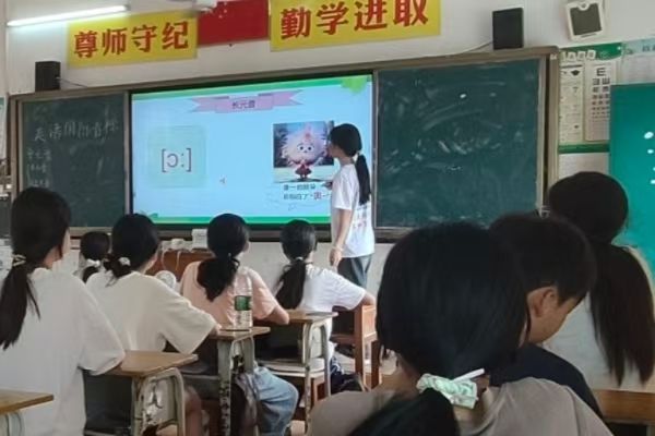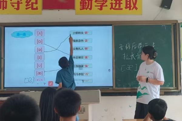 上午,英语课堂率先开展。课上,支教老师李思敏、陆榛通过生动示范与趣味互动,带领学生掌握音标发音技巧。课后,学生们依然愿意大声开口读音标的反应,展现了本次课堂对他们的影响之深:第一次直观认识到英语单词的拼读是如此有趣,纷纷期待下一节英语课的到来。让学生们对学习产生兴趣与期待,是我们为保障“三下乡”的课堂效果落下的结实一步。