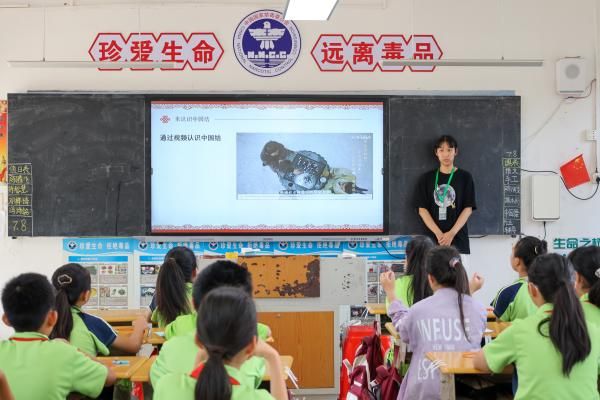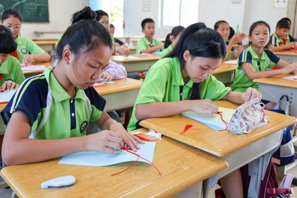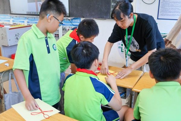 示范完成后,崔芳瑜老师时刻关注每一位学生的状态。每当学生露出苦恼的表情,她就俯下身,耐心亲切地教导学生,帮助他们掌握制作中国结的要领。崔芳瑜老师在指导前排学生的同时,也照顾后排学生,不断在多媒体屏幕上播放精心准备的步骤视频。通过老师温声细语的教导,学生制作中国结的动作愈发熟练。制作完成后,教室里洋溢着喜悦,学生捧着中国结,绽放出纯真美好的笑容。