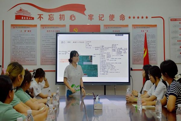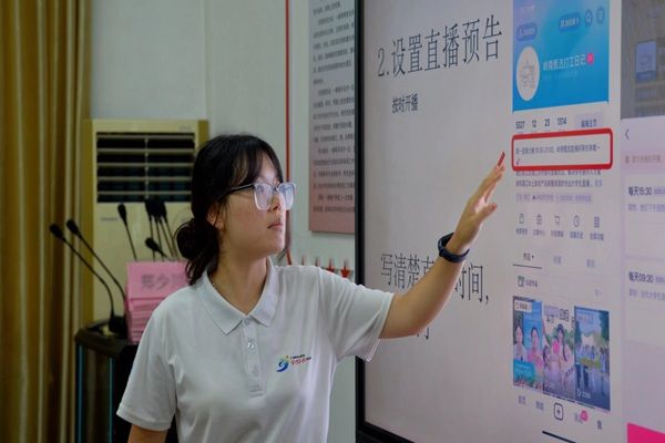 培训不是枯燥的理论课,而是实打实的操作指南。组员邓子晴详细讲解直播前的准备工作,比如怎么拍预热视频、怎么设计吸引人的话术,还特别提醒哪些词“千万不能说”,避免违规,从而确保直播合规流畅。