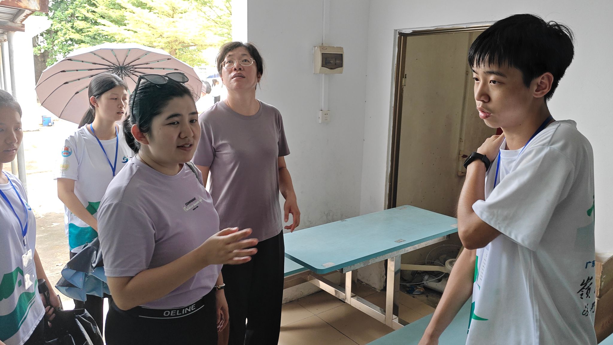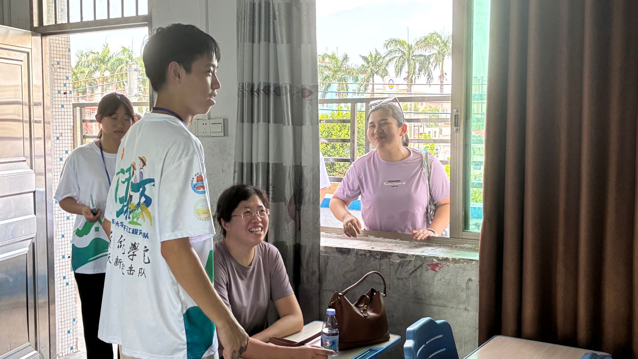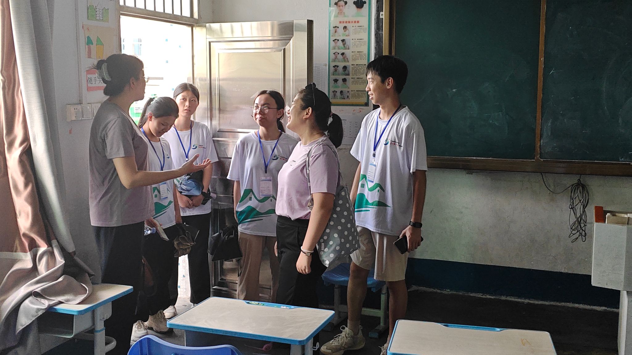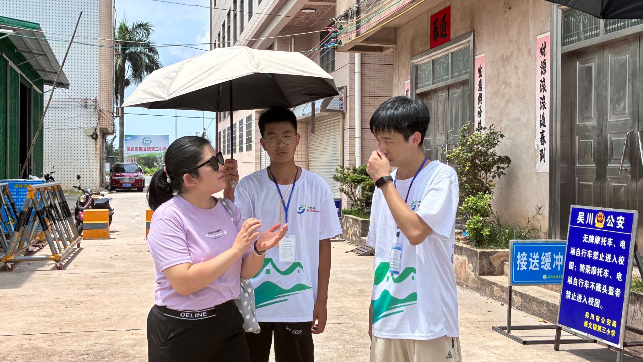 为了深入了解百千万工程社会实践活动的开展情况与工作进展,并切实推进百千万工程各项工作走深走实,7月14日上午11时30分,岭南师范学院代超群、周秀香两位老师深入广东省湛江市吴川县振文镇第三小学视察“沃野新绿”突击队在振文镇第三小学开展的百千万工程工作进展。由“沃野新绿”突击队队长骆栋泽、副队邓秋实、支教组长吴平恩、安保组组长廖美浩、新闻组组长梁文敏及宣传组组长岑昭颖等同学进行工作汇报。