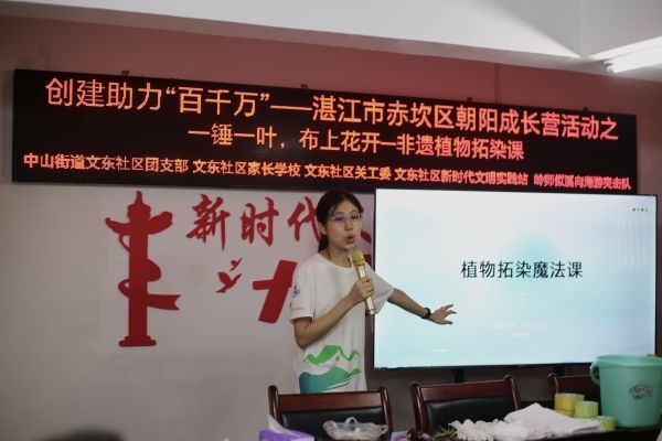 7月16日上午,中山街道文东社区团支部、文东社区家长学校、文东社区关工委、文东社区新时代文明实践站及岭师似溪向海游突击队联合开展一堂“一锤一叶,布上开花”的手工拓染课。师生以锤为具、以叶为材,融合传统技艺与自然之美,在棉布上绽放出绚烂的植物印记,让传统手工艺在实践中传递文化温度。