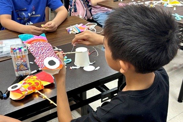 实践环节,小老师耐心指导孩子们制作游鱼灯。孩子们逐步学习骨架扎制、糊纸裱糊、装饰点睛等步骤,充分发挥想象力,在小老师们的协作下,孩子们一笔一画勾勒鳞纹,一剪一贴装饰彩绘,用心感受传统技艺中暗藏的巧思。