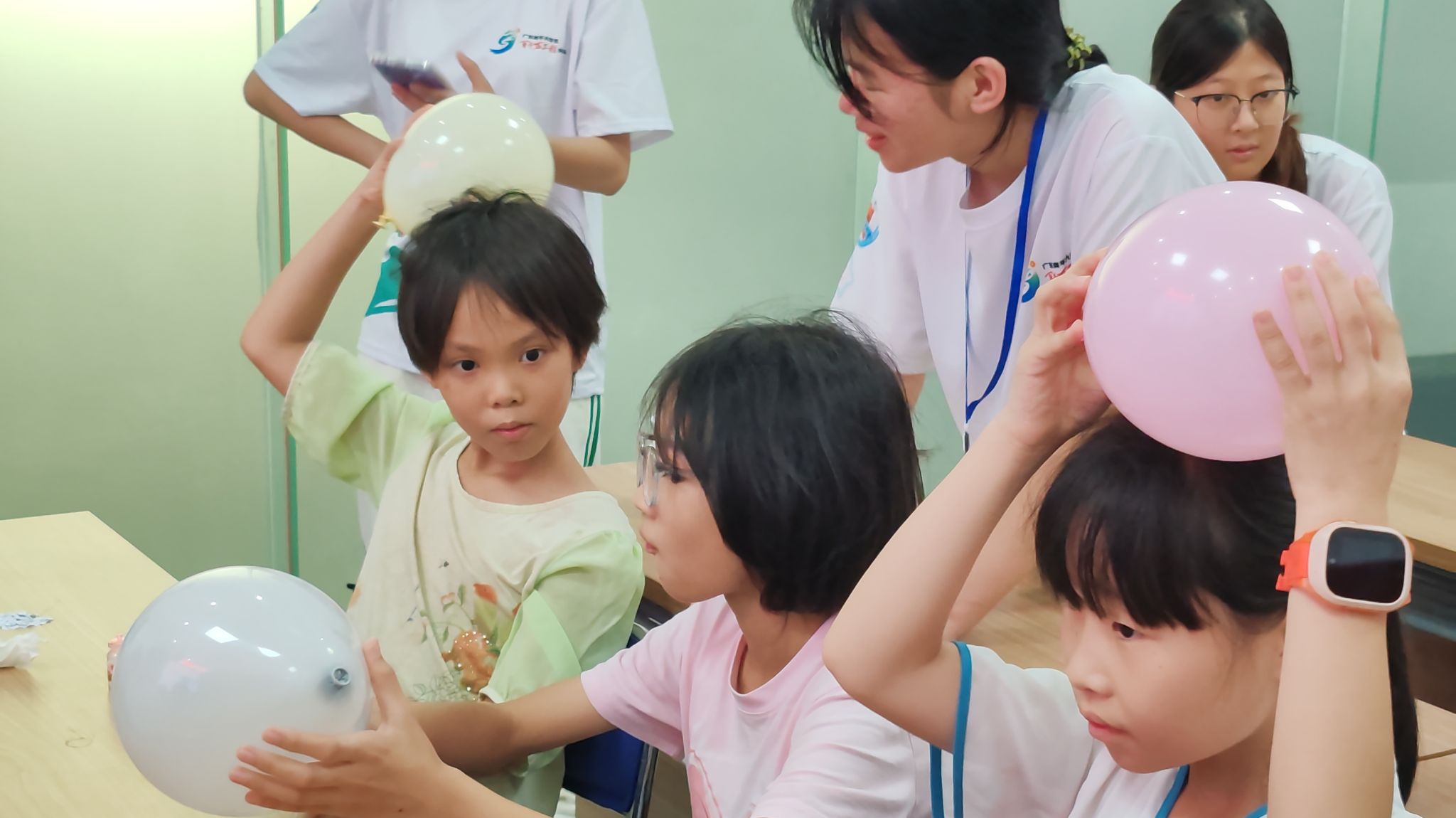 在水果电池实验之后,“知心童行”突击队又带来了一个让孩子们“哇”声不断的“气球抓纸屑”小魔术。队员们用彩色气球在头发上轻轻摩擦,再靠近碎纸片时,纸片竟像被施了魔法一样“跳”起来粘在气球上!