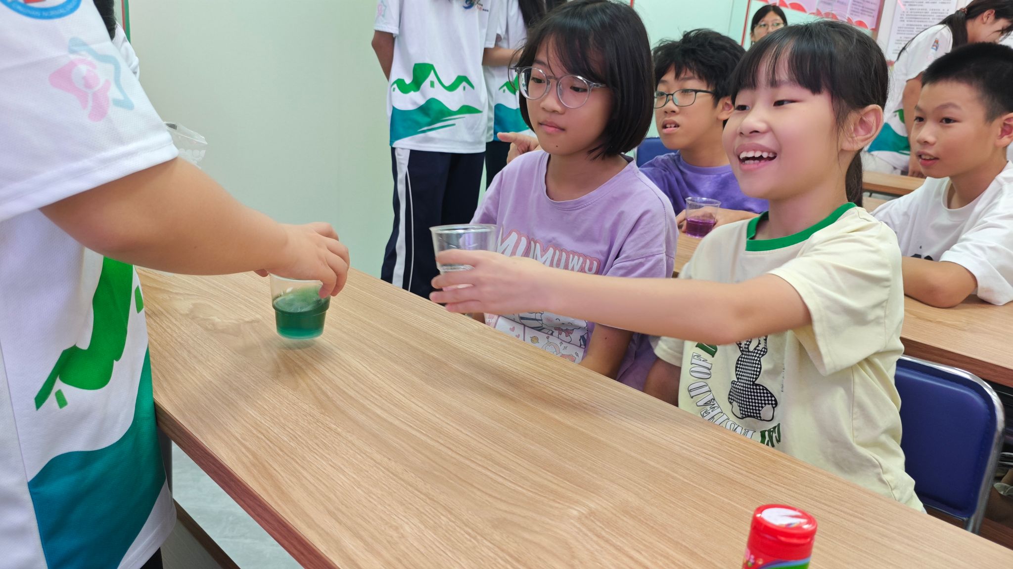 活动中,“个性化” 关怀贯穿始终。突击队队员与社区志愿者逐步引导,重复示范,通过 “不要求同步,只鼓励参与” 的方式,让每个孩子按自己的节奏探索。非牛顿流体实验更是让现场充满欢笑——孩子们轮流伸手触摸,感受“轻摸软成棉花糖、重拍硬似小石头”的奇妙触感,连爱重复动作的孩子,也被允许反复戳击流体,在自主探索中体会“力与形态”的关系。 “颜色的变变变”实验登场,不同溶液中变幻的色彩,让特殊孩子们瞪大双眼,脸上的笑容如同被点亮的星光。