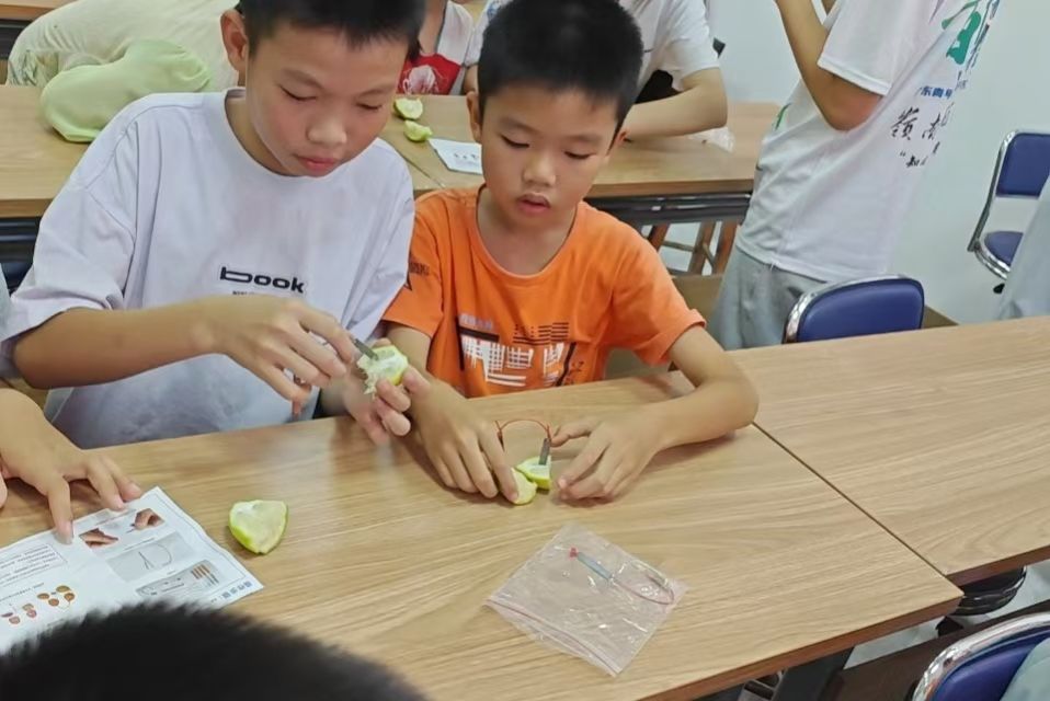 “知心童行”突击队带着“物理小魔术”解锁科学乐趣。在水果电池实验中,队员们把“电解质反应”转化为孩子能听懂的语言:“柠檬里的小能量在锌片和铜片间跑圈圈,就像小朋友手拉手转圈呀!”还将操作拆解成“放锌片、放铜片、连导线”三个简单步骤,手把手辅助孩子完成。当小灯泡亮起的瞬间,孩子们的惊呼里满是对科学的向往。