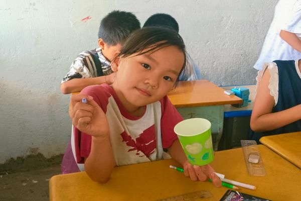 纸杯绘画课则成为孩子们挥洒创意的天地。卢老师让孩子们在白色纸杯上自由创作,孩子们立刻拿起彩笔投入创作:有的画出咧嘴笑的卡通小人,有的描绘着蓝天白云与彩虹,还有的用渐变色展现星空。从色彩选择上能看出孩子们的独特审美——有人偏爱蓝色、绿色等清新冷调,有人则钟情红色、黄色等温暖亮色,每一个纸杯都变成了独一无二的艺术品。