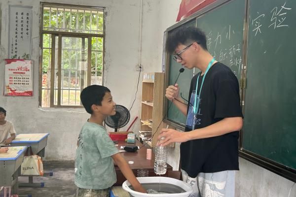 卢柏宇老师带来的浮力实验刚一开始就牢牢吸引孩子们的目光。课堂上,卢老师拿出提前准备好的装满水的玻璃瓶和乒乓球,先向孩子们抛出“将乒乓球放在水面上,它会浮起来吗”的问题,引发热烈讨论。随后通过“瓶子倒置后如何让水不流出”的实操环节,让孩子们轮流上台尝试,在一次次调整与观察中,直观感受浮力与大气压强的奇妙原理,课堂上不时响起恍然大悟的欢呼声。