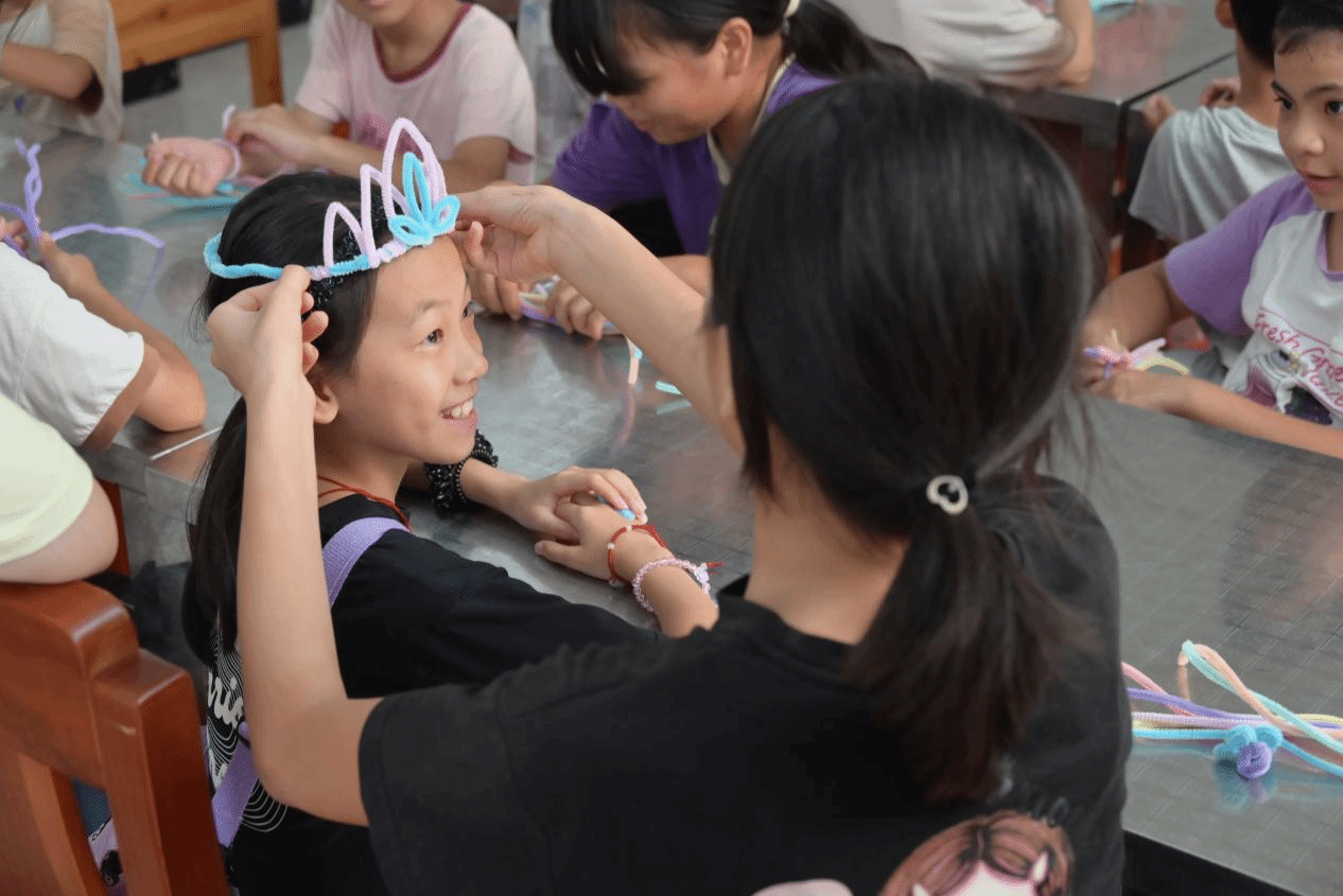 手工课上乐趣多:小戚老师带领孩子们用扭扭棒制作小花和“王冠”。8岁的晓晓戴上自己做的王冠,仰头说“我要当保护村庄的国王”时,教室里的掌声与笑声撞破了窗棂。戴上自己亲手扭出的、也许不那么规整却独一无二的彩色王冠,孩子们的小脸上洋溢着纯真的骄傲和满足。这堂手工课,不仅让扭扭棒焕发了新生,更在孩子们心中点亮创造的火花和自信的光芒。