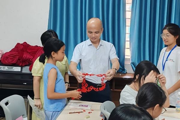 图为副书记在与孩子们交流剪纸 (陈铎尹 摄)
