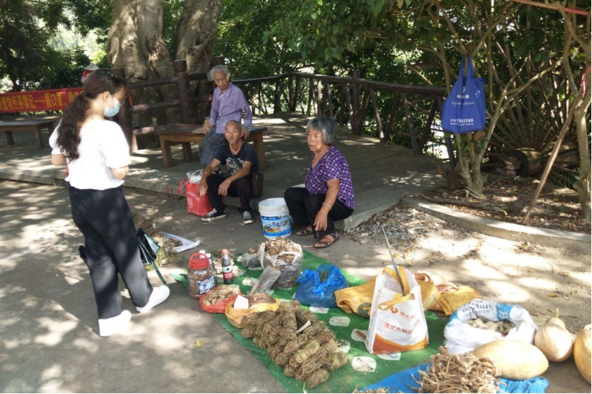 桥头边,一排坐着好几位耄耋老人,他们把家里的瓜果蔬菜药材等拿到桥头摆摊,供游客们、村里人等购买,当我们的队员上前询问摆出的药材都有什么作用时,爷爷奶奶都非常耐心的回答了我们,还非常和蔼的告诉我们怎么泡出味,他们脸上的笑容是我在金林村见过的最美的风景,他们的笑容或许就是他们生活幸福的标志吧!他们坐在一起有相互打趣的,有谈论家事的,也有谈论农耕收成的,在我脑海里随之联想到桃花源记里村民们无忧无虑的生活。