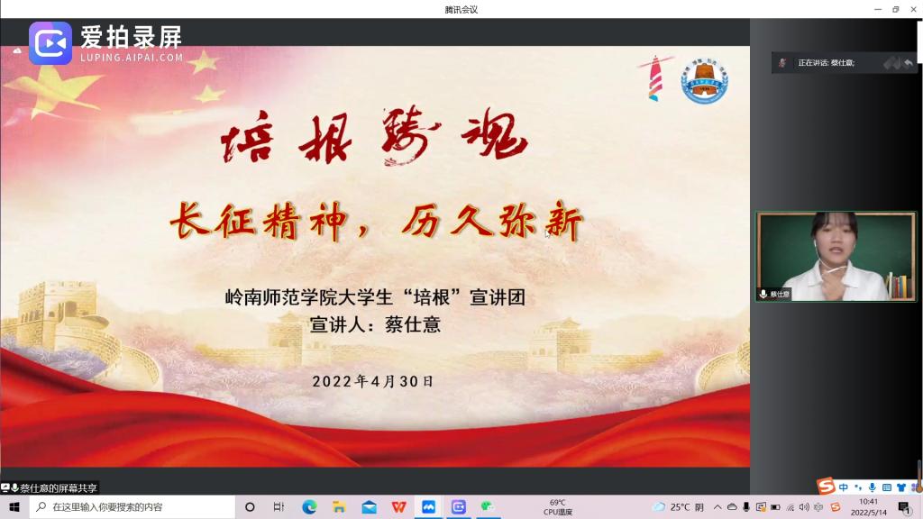 最后,蔡仕意就伟大长征精神对全体同学进行青年实际联系,她表示,如今处于新长征路上的我们,应该大力弘扬伟大的长征精神,从自身出发,努力学好科学文化知识,积极参加志愿者活动,宣传党史,传播正能量,成为社会需要的新时代青年。