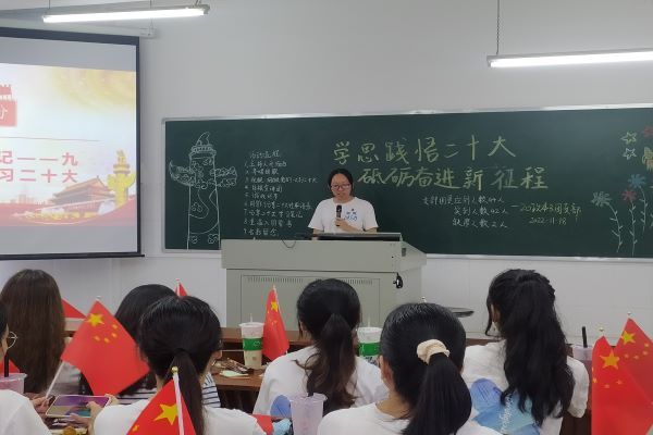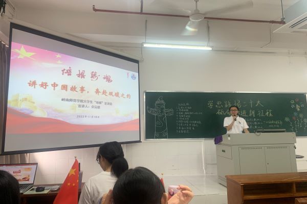 为学习贯彻党的二十大的精神,进一步增强广大岭师学子的使命感、责任感、担当感,2022年11月18日下午,岭南师范学院大学生“培根”宣讲团成员余沅骐,在岭南师范学院20政本3团支部举行的“学习贯彻党的二十大精神”主题团日活动上开展宣讲。