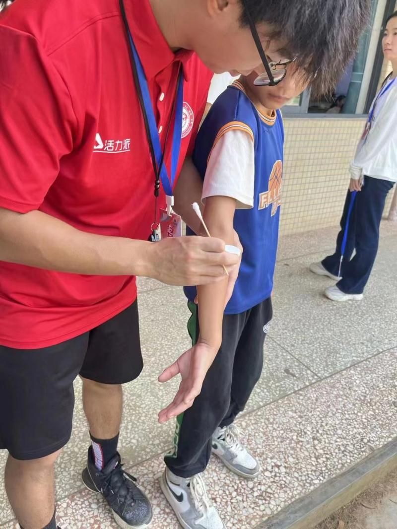 在一次活动中,小明不小心摔倒,擦伤了手肘。陈宇帆立刻上前为他的伤口消毒、涂药。面对有些生涩的小明,陈宇帆热情地询问他的爱好,鼓励他要勇敢地表达自己,学会和其他人交流。“在这个小小的学校里就不敢敞开心扉,以后怎么能走向更大的城市、更大的世界呢?”陈宇帆说。
