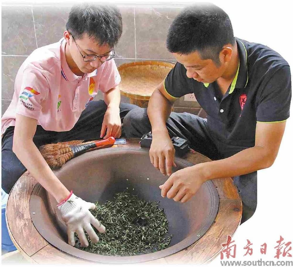 岭南师范学院的青衿志“百千万工程”突击队队员在茶园工作人员指导下炒制茶叶。受访者供图