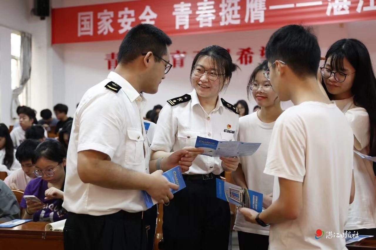 湛江海关办公室有关负责人作了题为《共筑保密防线,公民人人有责》的新保密法宣讲。湛江海关卫生检疫处工作人员以《筑牢国门生物安全屏障》为题,采用真实案例讲述、发放宣传资料、有奖问答等多种形式,为师生科普了口岸卫生检疫工作的具体内容。