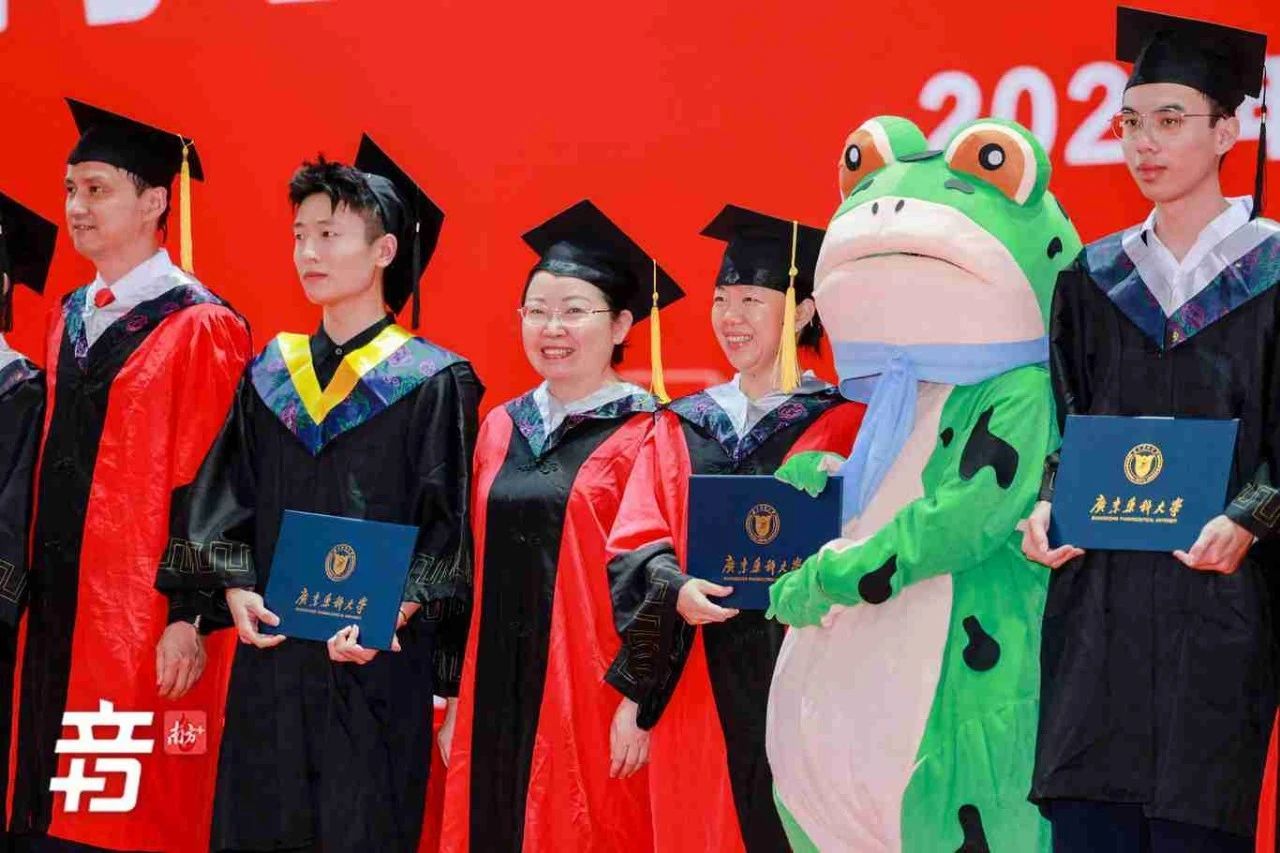 广东药科大学毕业典礼上出现了一只大青蛙“显眼包”,他淡定上台领取毕业证书,和同学们快乐合影。