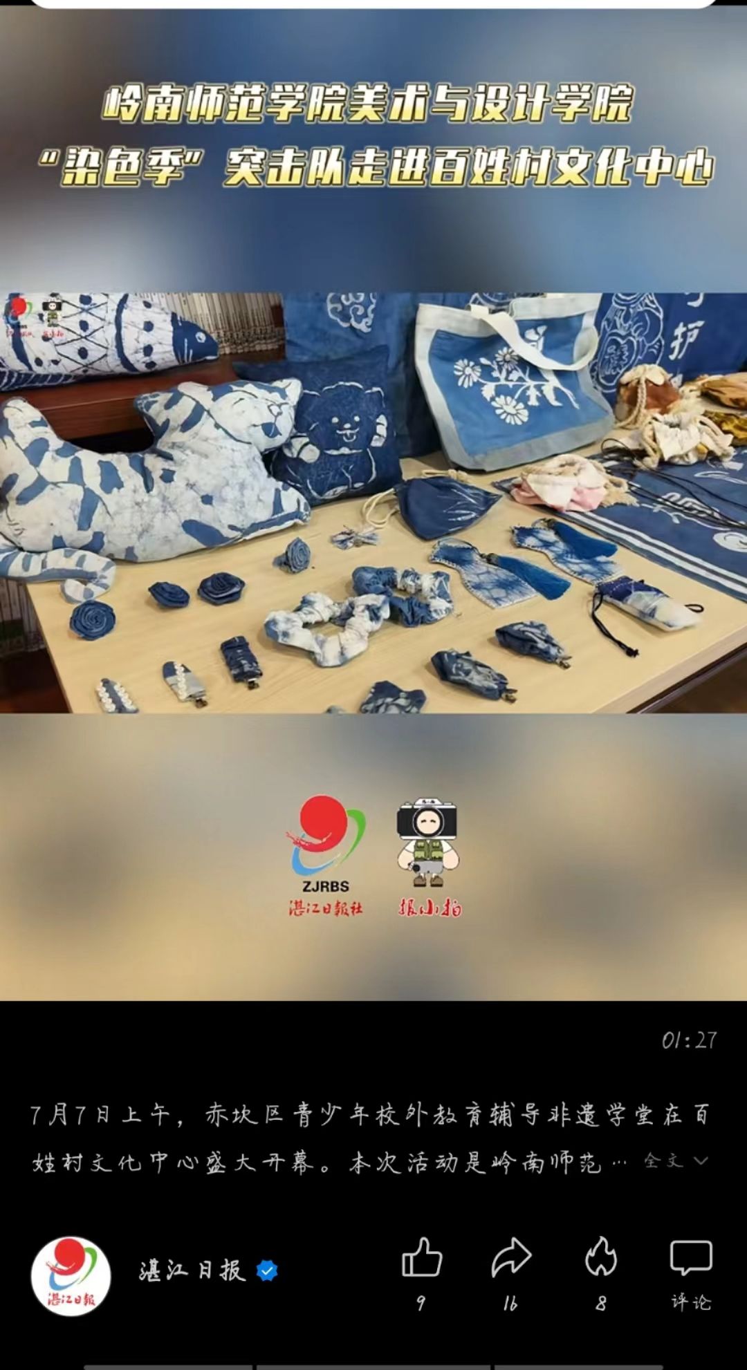 7月7日上午,赤坎区青少年校外教育辅导非遗学堂在百姓村文化中心盛大开幕。本次活动是岭南师范学院美术与设计学院谭永定老师带领广东青年大学生“百千万工程”突击队“染色季”开展突击队行动——扎染非遗作品展示与扎染技艺体验活动,旨在传承和推广中国传统的扎染技艺,丰富青少年的假期生活,培养他们的兴趣爱好和综合素质。