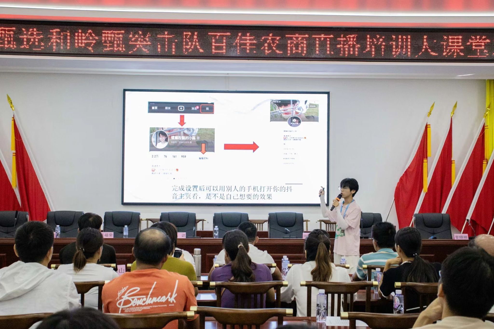 7月9日,岭南师范学院文学与传媒学院“岭南甄选”突击队在湛江徐闻县下洋镇政府综合会议室成功开展“百佳农商”直播培训大课堂2.0。队员们结合下乡实践,对去年“百佳农商”直播培训课程提质升级:从开设账号到直播间的搭设,再到直播的技巧与话术的传授,队员们“手把手”教学操作过程,将直播过程与短视频制作以更为直观明了的方式展现给当地农民与商户。
