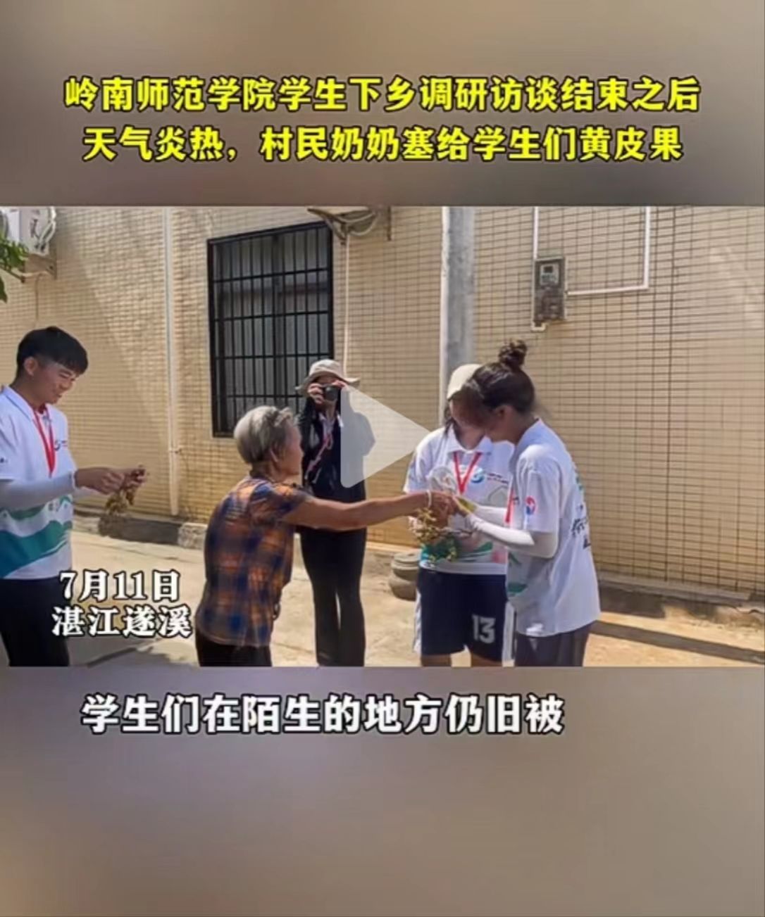 岭南师范学院学生下乡调研访谈结束后,天气炎热,村民奶奶塞给学生们黄皮果。在返程途中遇见一位饥饿的老爷爷,学生们毫不犹豫的给他买了包子和牛奶,将温暖互相传递!