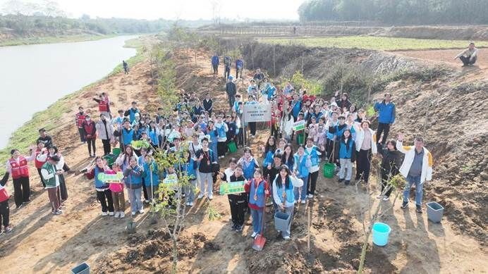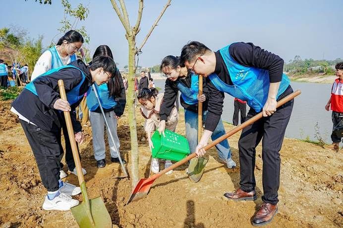 植树现场,志愿者和孩子们热情高涨、干劲十足。身着蓝色马甲的岭师志愿者与结对小学生组成“护绿搭档”,三五人一组,运树挖坑,铲土填树,提桶浇水,“师生搭档”挥汗如雨,交织成动人画卷。新栽的黄槐与紫花风铃树苗迎风而立,在春日的阳光下,新抽的嫩芽折射出翡翠般的光泽。这些由师生共同浇灌的生命,终将长成参天大树,赓续“百年师范”与“绿美广东”的春天故事。