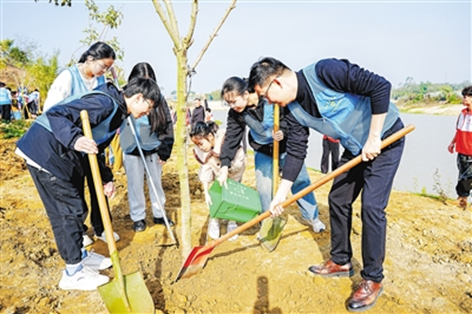 植树现场,岭师志愿者和孩子们热情高涨、干劲十足。身着蓝色马甲的志愿者与结对小学生组成“护绿搭档”,三五人一组,运树挖坑,铲土栽树,提桶浇水,“护绿搭档”挥汗如雨,交织成动人画卷。新栽的黄槐与紫花风铃树苗迎风而立,在春日的阳光下,新抽的嫩芽折射出动人的光泽。