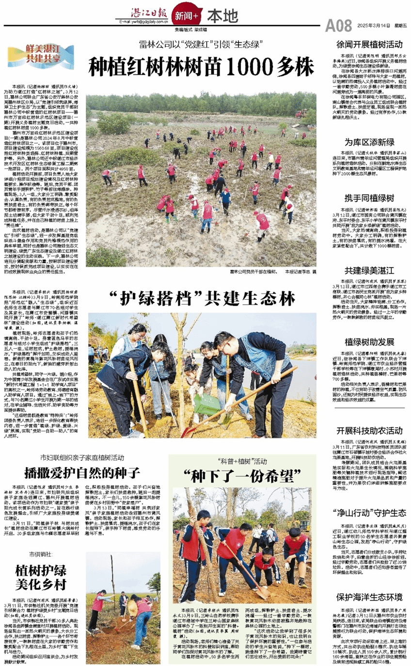 本报讯 (记者卓朝兴 通讯员杨丽君 陈思妍 江雅玲)3月9日,岭南师范学院把“师范红”融入“生态绿”,组织近百名师生志愿者与廉江市70名结对学生及其家长,在廉江市安铺镇、河唇镇共同开展了“岭师·湛江廉江新时代希望林”建设活动(如图,通讯员李妍敏 温增康 摄)。