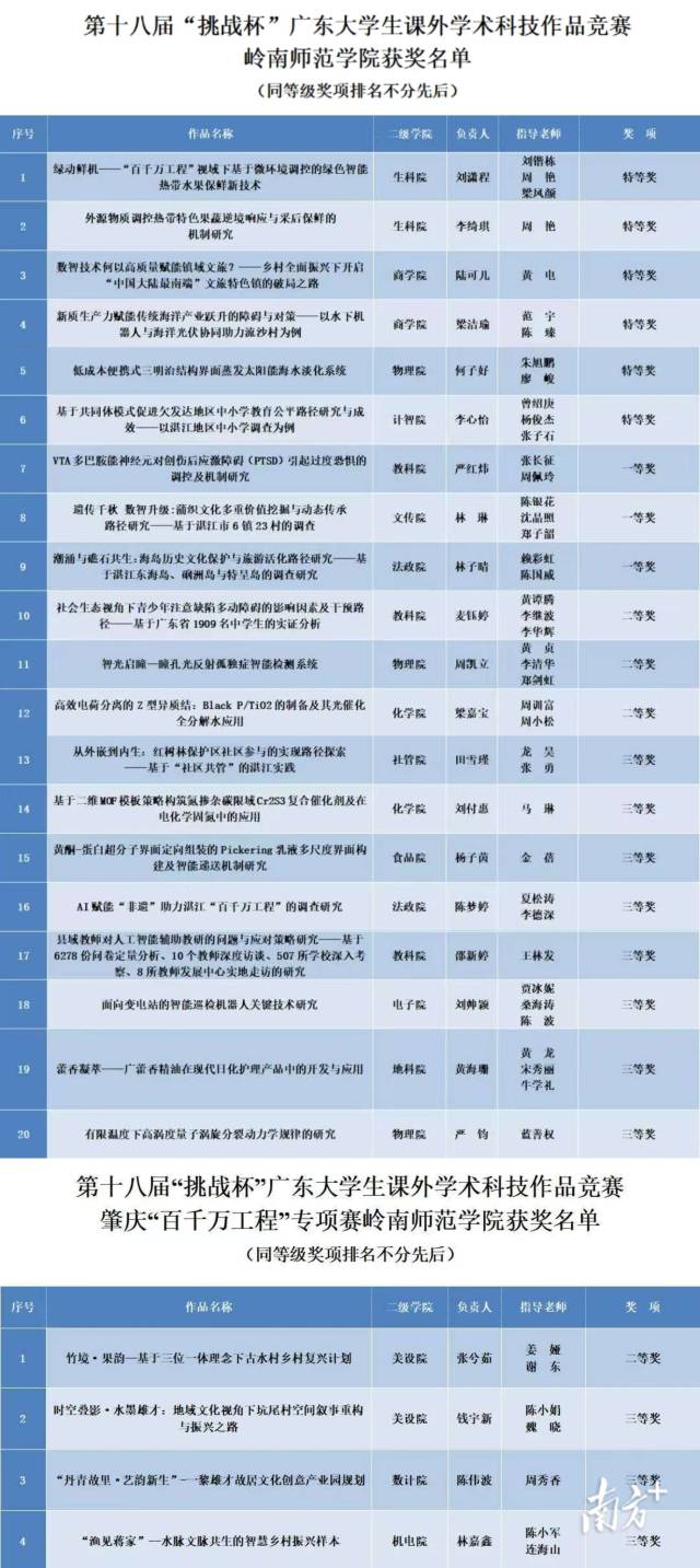 5月17日至19日,第十八届“挑战杯”广东大学生课外学术科技作品竞赛终审决赛在肇庆学院举行。岭南师范学院师生不畏强手,顽强拼搏,在主体赛中斩获特等奖6项、一等奖3项、二等奖3项、三等奖8项,同时获得“百千万工程”肇庆专项赛二等奖1项、三等奖3项。岭师团体总分位列全省本科高校第九位,连续十届捧得省赛“优胜杯”,团体总分和特等奖数量均创历史最好成绩。