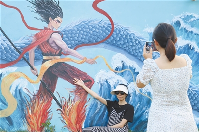 墙上,哪吒威风凛凛,一条蓝色的巨龙立在翻滚的波浪上,细节满满,电影里的场景重现在下洋这片海。前来的市民游客纷纷拍照发圈,惊叹道,“暑假来了,哪吒也来了”。