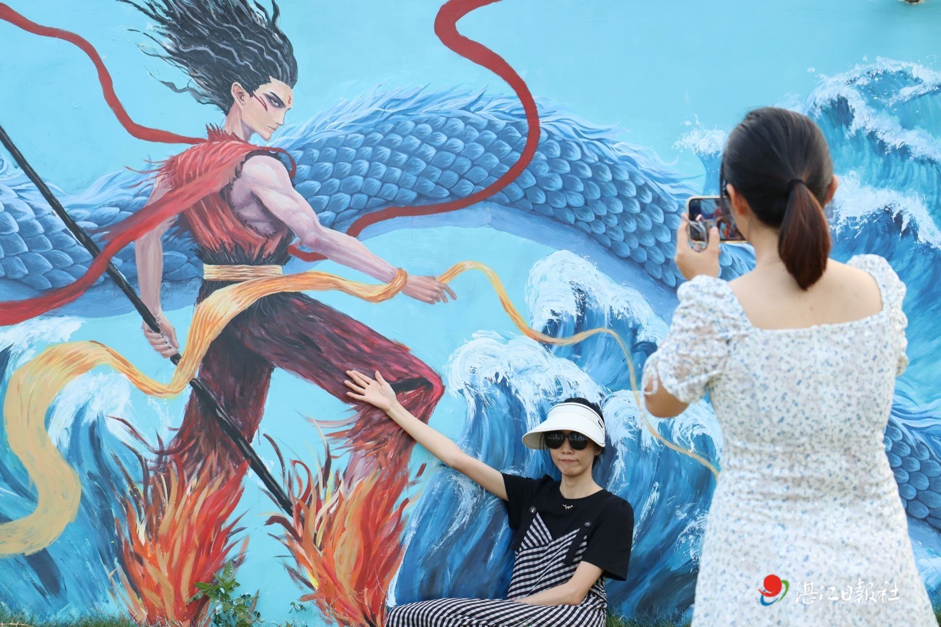 游客打卡徐闻下洋南端暖滩的30米哪吒主题墙绘。