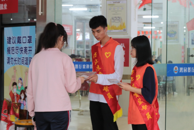 当天用餐高峰时段,青年志愿者在食堂门口派发学校“厉行节约、反对浪费”倡议书,呼吁同学们争做“光盘侠”,当好“宣传员”,主动加入制止餐饮浪费行动中,把勤俭节约的理念传递给更多的人,共建文明、和谐、美丽的“绿色”校园。