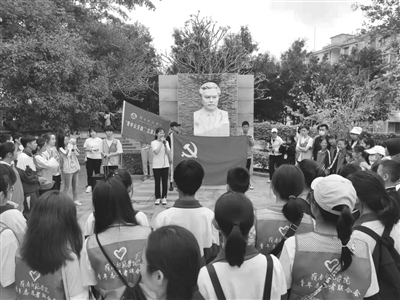 “谭平山是一位出色的革命家和爱国主义人士。”在岭师谭平山纪念园中,鲜红的党旗迎风展开,50多名大中小学生围成半圆面向党旗站立,脸上神情专注。岭师2020级英语专业大学生黄柏铨和黄雨曦正在为众人宣讲党史。她们用朴实易懂的语言,娓娓讲述着党旗的由来,饱含深情地讲述了岭师前身——雷阳中学校长、革命先辈谭平山不懈奋斗的革命故事。