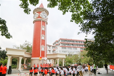 13名青马学员首先上场饱含深情朗诵《青春中国》。接着,5名学生代表畅谈了他们参加湛江市“青马工程”大学生骨干培训班的学习体会。在纪念广场内的谭平山爱国主义教育基地,来自教育科学学院的大学生黄田秀通过该校学生创作的一幅画作,介绍了广东南路革命运动的发起人之一、老校友黄学增的革命事迹。当听到黄学增为了追求革命理想、牺牲时年仅29岁时,同学们都十分动容。这些“身边的红色记忆”,让在场师生重回那个浴血奋战、顽强不息的光荣年代,在校史人物的故事中汲取前进的力量,赓续红色血脉。在鲜艳的团旗前,100名团员代表重温入团誓词,铿锵有力的宣誓响彻燕岭天空。最后,激越洪亮的大合唱《映山红》《我们都是追梦人》响彻广场,掀起活动的高潮。