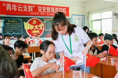在线下支教中,岭师大学生志愿者积极推进“党史教育进百校”活动,把党史知识巧妙地融入日常教学中,引导孩子们在主题板报、知识问答、创意手工、体育比赛、感恩植树、文艺汇演等红色实践课堂中主动动手、动口、动脑。而在“云端”的支教课堂上,大学生志愿者不约而同地在课业辅导中增加了党史宣讲,向帮扶孩子推荐红色书籍、教唱红色歌曲、共绘红色画作……“要努力让红色文化的种子,在孩子们心中萌芽。”岭师2019级英语专业大学生陈媛媛表示。