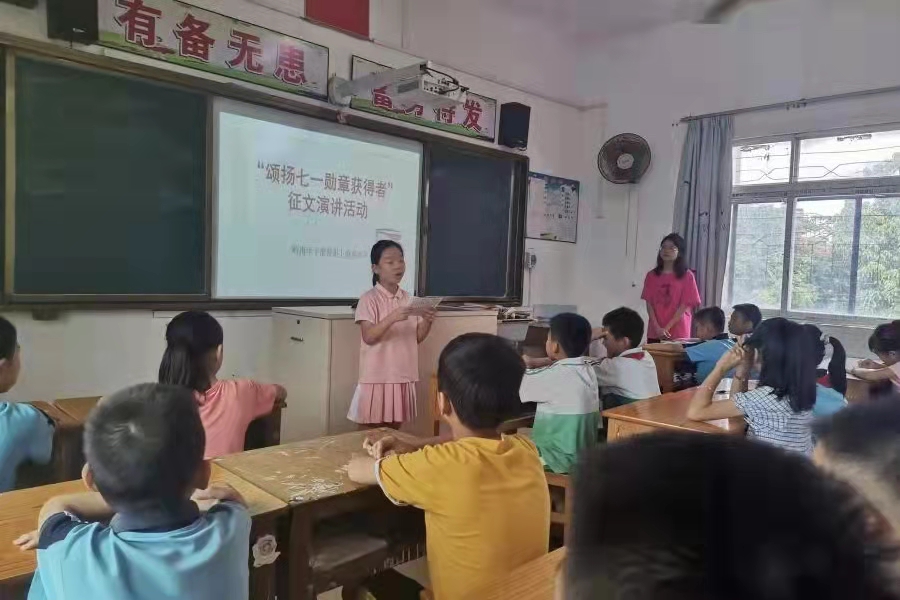 为庆祝建党百年,传承红色精神,实践队在下海小学开展党史学习教育、党的故事分享会、“颂扬七一勋章获得者”征文演讲等活动。队员带领孩子们把对党、对祖国的热爱融入语言文字中,展示中国少年的风采,感受中国共产党的伟大。